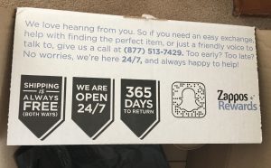 I love that the Zappos branding promise is summed up in the printed message on the box. And when I ordered shoes recently, Zappos definitely delivered.