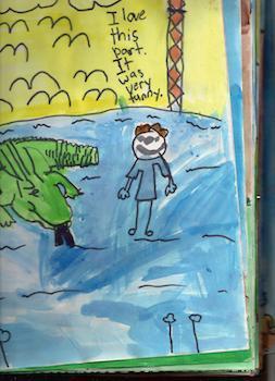 Student drawing of the alligator eating Skillit’s pants. They love that scene!