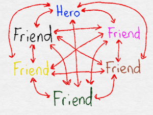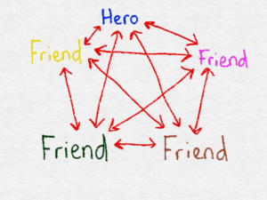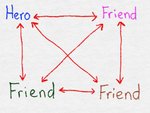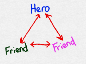 Here’s one of the most common setups. Our hero has two buddies, making three relationships. It’s enough characters for them to play off each other a bit, or have a love triangle, or for one to die, or whatever. Plus, people just like the number three, and triangles make for good art.