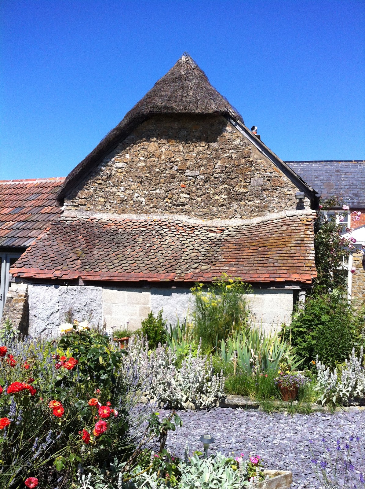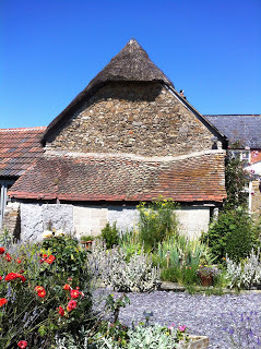 Here is a perfect roof and wall and garden. Found - well, discovered - in Dorset this week end. Here is everything I need for a wonderful story, a path leading somewhere, an old tiled roof, a gable end, a thatch. It's going into my new book. I love the wonky rippled roof and the way two different shaped tiles have been used. One half of the roof is thatch and one is tiles.And of course the blue sky. What a novelty.I'm putting it into my chapter now, just as soon as I stop faffing about with blogs.