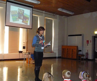 This is me in the school hall, talking to the KS2 children about some of my books which feature my three boys, Joe, Laurie and Theo and our dog, Nike.