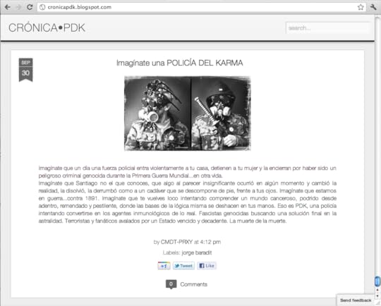 El blog que acoge los capítulos de un reportaje falso donde se cuentan los supuestos orígenes de la PDK en código de programa tipo Informe Especial. Un TREMENDO esfuerzo de estudio 19 y en particular de Inti Carrizo-Ortiz.