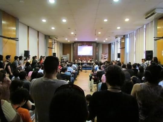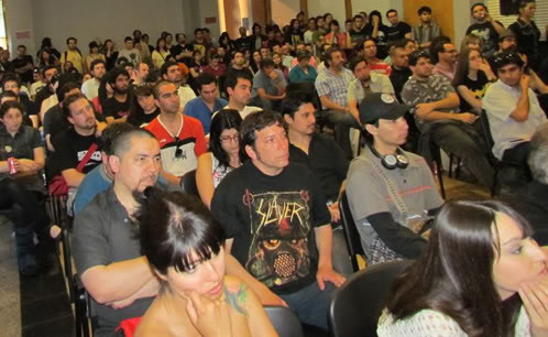 La fila superó con creces lo esperado y con Martín Cáceres terminamos firmando más de 100 ejemplares antes de salir volando a la sala de presentación. Allí la gente de Ediciones B, Cristián Cid, Judy Meneses, Rocío Barraza y todos los cracks, nos ayudaron a descolgar el telón; Inti, la Angela y la gente del equipo técnico de FILSA apoyando la instalación del laptop, la proyección y el audio; y los coordinadores ayudando a repartir la ENORME cantidad de gente que quería entrar a la sala (mi amigote Pancho Ortega terminó afuera de la sala en puntas de pie mirando). Quedó gente hasta en la escala sin poder ingresar. Un lujo. Gracias por eso a todos.