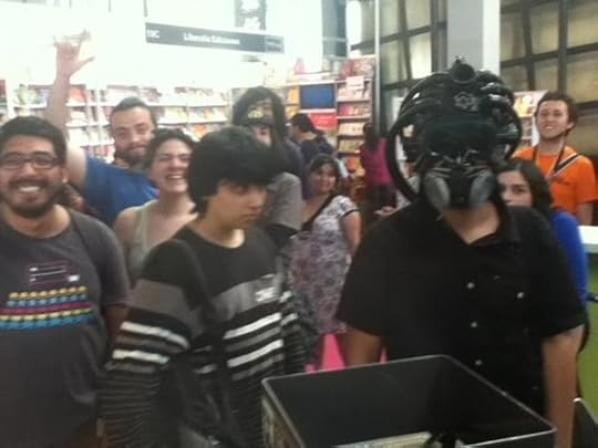 Para cerrar leí una lista de agradecimientos que siempre se va a quedar corta. Primero agradecimientos a todos los que fueron ese día, soportaron el calor, se vistieron como PRXY, llevaron sus poleras de SYNCO y sus libros para firmar. Gracias de verdad, porque no es un cliché cuando se dice que nada funciona sin ustedes. PDK, además, inspiró a mucha gente talentosa que se fue sumando en el camino. Partí con los 14 ilustradores que generosamente ilustraron partes del cuento original y brillaron con su talento a página completa en el interior de la novela gráfica; seguimos con quienes se habían hecho cargo de producciones complejas audiovisuales, como Inti, Nicolorca o Jorge Roa; seguimos con los brothers de Lluvia Ácida: Héctor Aguilar y Rafa Cheuquelaf, DJ Fracaso, Daniel Jeffs, Mika Martini de PUEBLO NUEVO Netlabel, Rodrigo Vásquez y Juan Calamares que se inspiraron en el mundo PDK para producir un soundtrack precioso tremendamente pro y luminoso; mencioné a la Simone Fachel y sus amigos berlineses que le pusieron voces en hebreo y alemán al CMDT PRXY; mucha gente que ni siquiera me conocía y pusieron sus talentos y tiempo al servicio de la PDK; menciones especiales a Marcelo Vera y Javier Fernández, media experts que usaron su valioso tiempo en apoyar y desarrollar el proyecto completo. Gracias a la flaca Leigh, a los Marcelos, a Nostok, la Nato, Gerardo y toda la Neuroguerrilla que se hizo presente, aplaudió y colaboró escribiendo maravillosos cuentos en el blog CRÓNICAS DE LA PDK, reducto prácticamente de su propiedad. Gracias a un montón de gente que seguro se me va a olvidar.