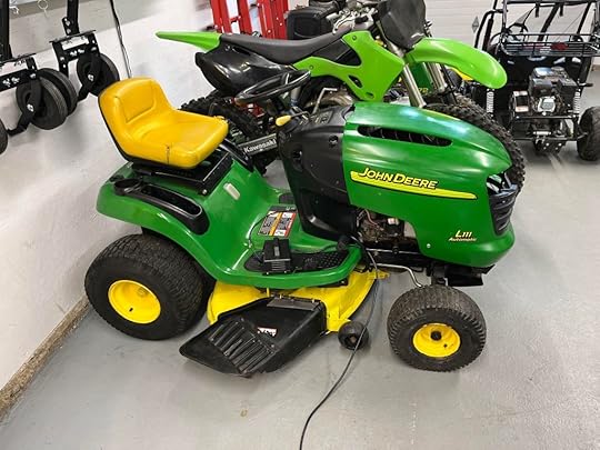 The shiny new-to-me lawnmower was now perfectly positioned, facing the correct way and ready to mow. I hopped on—the seat seemed comfortable. I turned the key, with Ken looking on jealously.