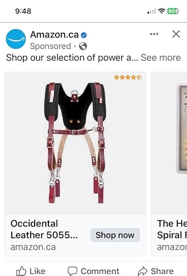 I ask this question only because I’ve been getting some very strange ads in my social media lately. I don’t mind the run-of-the-mill exhortations to buy hot tubs/swim spas, funny t-shirts, and retirement planning. I don’t even mean strange like Amazon recommending my own book to me, which happens all the time. No, I mean strange, like “I don’t have a f*cking clue what this thing is and I have no idea why you think I’d even want one!”