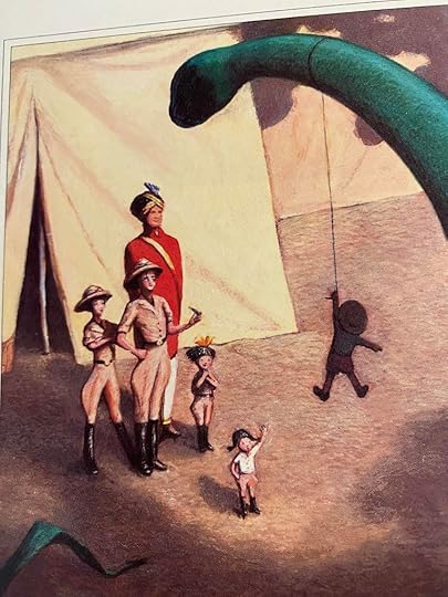 Recently, I started tutoring to earn a little extra money, now that I’m no longer working at the antique market. I still have a lot of teaching resources, including children’s books, in one of the guest bedroom closets, so I went through the stack of books the other night, looking for something that might interest one of my new students, a child in grade 2. I found a couple of cool I Spy books and some other fun reads, and then I found a book called Dinosaur Bob And His Adventures With The Family Lazardo. I couldn’t remember ever buying it or even reading it to Kate when she was little, and I started flipping through it. Here’s the gist of the story: An American family named Lazardo goes on safari and finds a dinosaur which they bring back to the States and it causes a lot of issues but in the end, (spoiler alert), the dinosaur helps their town baseball team win a big game. And that explanation is only slightly longer than the title of the book. But that’s not the weird part. The fact that they go on an AFRICAN SAFARI with their small children and find a dinosaur isn’t even the weird part. No, the thing that absolutely confounds me is this. On the cover of this book, which was written in 1988 by the way, and on almost every page, there is a man wearing a regimental uniform and a turban. He is briefly described on the first page, when the family initially encounters the dinosaur thusly: “Jumbu, their bodyguard, said nothing.”