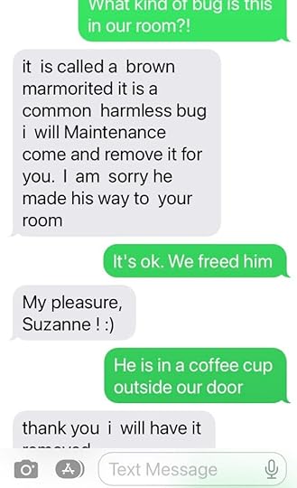 Well, before you could even say “I’m actually not an AI but a real person who is extremely flustered right now”, the response came: “It is called a brown marmorited it is a common harmless bug i will Maintenance come and remove it for you. I am sorry he made his way to your room.” And IMMEDIATELY after the message, there was a knock on the door. I didn’t know what to expect, but when I opened it, there was a guy standing there with a ladder and a roll of paper towels. We gave him the bugs, which we had carefully wrapped in toilet paper, and instructed him to let them outside. He looked at us like we were out of our minds, but nodded and left.