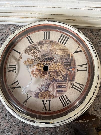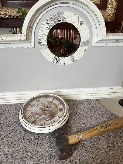 So he popped the clock face out of the case and put it to rights. I left for work. I got home a few hours later, and went up to my bathroom to retrieve a part-bottle of wine that I’d hidden there on Friday night (that’s another story), and I looked at the clock. It now said 6:05. Which would have been fine, except it was 4:05. I took it down off the shelf—the hour hand was now loosey-goosey, having fallen off the stem when Ken took the face out. And the whole thing was encased in plastic. There was no conceivable way to fix it, despite my best efforts, which involved looking at it questioningly and shaking it. Then I had a brainstorm—I had recently purchased an antique mantel clock that someone had converted into a battery-operated one, but the battery pack was broken. If I could only get the hands out of THIS clock, I could put the whole contraption in the antique one. But how? I would need a hammer. But if you know anything about me at all, you know that I keep a hammer in almost every room of the house. So I got out my bathroom hammer and broke the plastic casing—carefully of course, because I needed the hands intact.