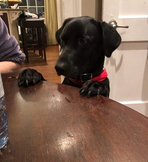 So the food stayed in the bowl until dinnertime. Atlas sat where he always does, kitty corner between me and Kate, hoping that someone would give him “summadis”.