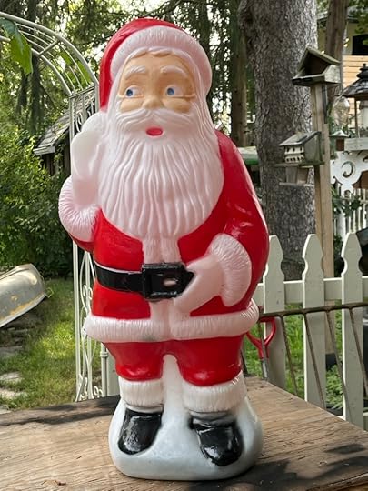 It’s gotten quite a lot busier at work lately. First, because the summer construction project that was supposed to finish in September is finally done, and people have actually stopped using the antique market parking lot as a bypass/speedway and are now parking and shopping, and second, because Christmas is coming and everyone buys their Christmas antiques in November. The current trend, carried over from last year is BLOW MOLDS. If you don’t know what a blow mold is, it’s a large plastic figure in the shape of a Santa or a Snowman, made out of plastic which has been blown into a mold—hence the name. They plug in and light up at night, turning your house into a veritable winter wonderland, even if you still don’t have any snow. These things are getting as expensive to buy as ceramic Christmas trees (you know, the ones everybody’s grandma had in the 70s). And the more savvy collectors are looking for the extra, the unique, the really hard-to-find ones. Currently, about the cashier’s counter, we have a giant blow mold Santa in a blow mold sleigh, with a team of blow mold reindeer pulling him. Along the side, it says “Noel”, which already caused a stir because one of the young bosses had apparently never taken French in school and thought that Noel was Santa’s first name, like “Noel Santa Claus” and we all had a good laugh until someone corrected him.