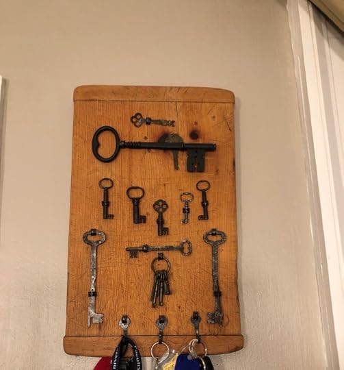 A few days ago, I was in the kitchen and I happened to look up at the really cute key holder on the wall that I’d made out of an old breadboard and antique keys to hold not-antique keys. My brow furrowed. “Ken!” I called. “Did you put all those keys on that lanyard and hang it on the key holder?”