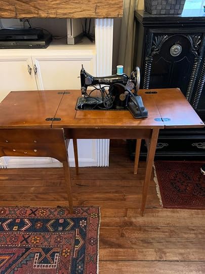 Now that the squares are hypothetically cut, I have to sew them together. Normally, I just use a staple gun when I work with fabric—in fact, I recovered all of our breakfast room chairs a couple of weeks ago and all I needed was a pair of scissors and a staple gun. At first, I figured I could just hand-sew the squares, like the way I sewed up a rip in Kate’s leggings the other day. But when I considered the sad state of my sewing basket (it’s actually a Quality Street tin with a hotel sewing kit in it) and the time it took me to thread the needle, let alone the ten minutes to stitch up a 1 inch rip, I decided against that. So I needed to buy a sewing machine. And wow, those f*ckers are expensive! Luckily, I was on Facebook Marketplace and saw an ad for an old Singer that some woman was selling for thirty-five bucks, which seemed like a good deal. And in the ad, to prove it worked, she was demonstrating sewing a piece of denim! Talk about kismet.