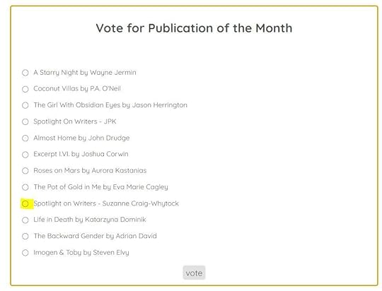 I know it seems like I’m always asking people to do this, but I just received a surprise email telling me that my Author Spotlight (Suzanne Craig-Whytock) has been nominated for Publication of the Month over at Spillwords Press. The deal is the same as last time: if you vote for me and let me know, I’ll use your name in an upcoming short story or novel. I’ll really do it—if you don’t believe me, wait until my new short story collection Feasting Upon The Bones comes out this summer (Potters Grove Press). A lot of your names are in it!