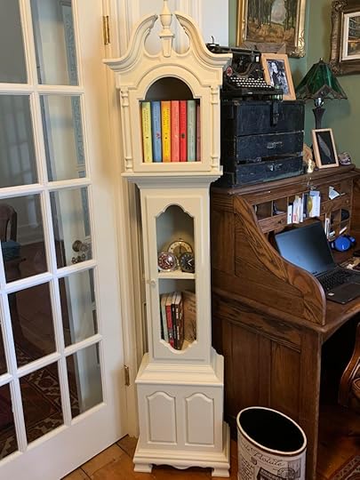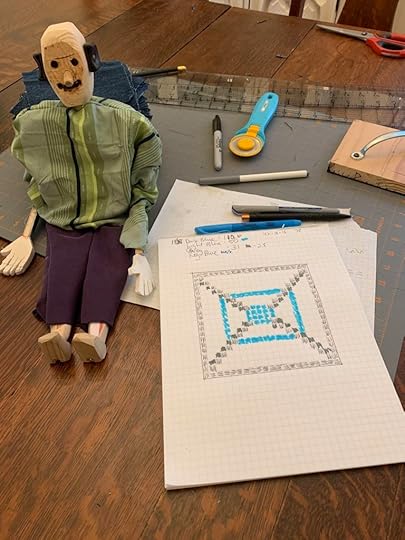 Quilt Update: All patches are cut, and the design has been laid out. Ken figured out how to use the sewing machine because he made a wooden marionette out of some scrap wood and decided to sew it a little shirt and pair of pants. I’ve named the marionette Marty, and he’s adorable in a kind of grotesque way and definitely has Ken’s fashion sense, but at least now Ken can teach me how to sew. Also, just in case you think I haven’t been busy, I also made this cool bookcase out of a 1970s grandfather clock shell.