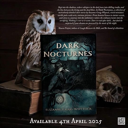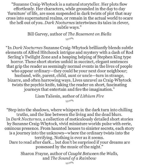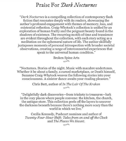 “Step into the shadows and explore the hidden corners of existence in Suzanne Craig-Whytock’s captivating collection Dark Nocturnes, where ordinary lives intertwine with extraordinary circumstances, where the line between reality and fantasy blurs with each turn of the page. Wander through the echoing corridors of old manor houses and deep forests, explore hidden rooms and cavernous antique markets, dance with menacing marionettes and life-size dolls. Lyrical, haunting, and occasionally humorous, Dark Nocturnes is a collection of thirty-two stories that explore joy and sorrow, gratitude and grief, and hatred and desire. Open the cover, feast on the stories inside…and if you’re lucky, Mr. Death just might show up for dessert.”