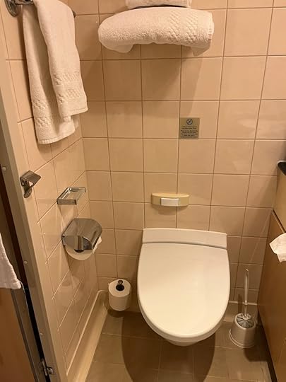 So Ken and I are currently travelling across the Atlantic on a large boat, the Queen Mary 2 to be precise. We’re on our way to the UK to visit family with my parents. Currently, Ken is driving me crazy by suggesting things I can write (“tell them you hate jazz”) because he’s too cheap to pay for the wifi plan and he is bored. “God help you if you were ever locked in the bathroom with me,” he just opined. And yes, that would be horrible. Not because of Ken, who has stopped talking about his tendency to flatulate in small spaces when he realized I was writing everything he said down, but because the bathroom in our stateroom, while frustratingly typical in that the flush mechanism is BEHIND the toilet lid, forcing you to TOUCH the lid in order to flush the toilet, is extremely small and very strange. Here’s a photograph: