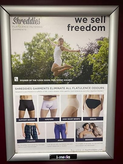 And I have SO many questions about the FART PANTS!! Do they have these in any other country?! Is it something particular to the British diet that flatulence is such an issue that they needed to invent wearable filters for every occasion?! Do they work?! Why have I never seen this in the WOMEN’S bathroom?! And why, in the name of all that is holy, are they called SHREDDIES??!! Are men buying these for their wives and vice versa?: