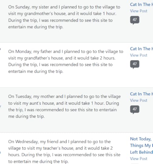 One thing about sites like WordPress is the sheer amount of spam comments that never seem to end. My spam folder used to be full of bizarre folks telling how intriguing my site was, offering to detail my RV, and providing unsolicited medical information that looked like it was lifted out of textbooks. I finally managed to come up with the right keywords (or WordPress tightened their security), because I rarely get more than 3 spam comments a week now—the rest just go straight into the trash. But the other day, I was worried that I’d inadvertently deleted a follower’s comment and went to the trash to find it. I didn’t find my follower’s comment but what I discovered there was incredible. Apparently there is a village that people travel to every day, and MY BLOG is on the recommending reading list! People go to this village to visit their sisters, brothers, grandparents, and friends, and on the way there, which is a 1 to 2 hour trip apparently, all they want to do is laugh at the madcap antics of mydangblog. I have to say, it’s a true honour—like doing a reading event WITHOUT the crippling anxiety.