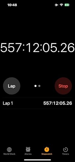 And I’m certain that there will be an incredible outpouring of emotion when I show them the stopwatch on my phone, which I started when I was doing a live reading last month (because each reader was only allowed 5 minutes and I was terrified of going over and being subtly admonished) and then completely forgot about—it chronicled the seconds of my life for over 23 days before I realized that it was still running. Oh, the tears we in the village would shed as we lamented the passage of time.