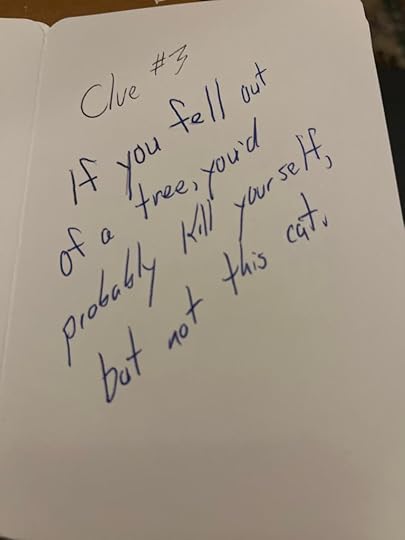 I ran up to our bedroom and sure enough—a lovely bottle of wine was nestled against my pillow. Carrying two bottles of wine in hand, I ran to the cat tree as per the next clue: