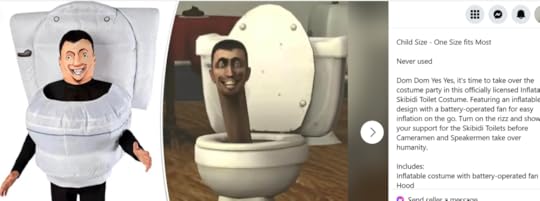 I read the description and yes, it seems to be in English but I’m unfamiliar with many of the terms so I had to look them up. “Skibidi” can mean either “good, cool, bad, or evil” according to the interweb. I’m going to let you decide which one it is in this context but you can probably imagine what I’M leaning towards. “Rizz” is apparently “charisma”, and I’m not sure how charismatic you can actually be with a toilet on your head. And please, I’m begging you–don’t look up Dom Dom. I did, and both Atlas and I are scarred for life. Finally, I think the person selling this isn’t very confident that people will understand it’s a costume and not HIM because the ad uses the word “inflatable” or a variation thereof, FOUR times in one short ad. Yes, we get that it’s INFLATABLE. And either child-sized or one size fits most…