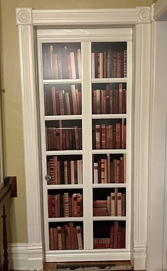 It’s been another crafty week at the mydangblog household. First, you may remember the peel and stick wallpaper that Ken and I used to create the illusion of a bookcase door which leads to our secret library? Well, it’s not much of an illusion when it starts to fall off the panel attached to the door (as if the illusion wasn’t already problematic based on the size, and worse, the bizarre titles of the books on the peel and stick bookcase—Dawn Fly Stuff is still my favourite and you can read about all the rest in a previous post called Lost In Translation). But my tremendous disappointment at the less than sticky stickers was relieved when Ken said, “I have a great idea—I’ll get some trim and moulding and tack it all down with actual wood that looks like a bookshelf.” And that’s what he did. It looks even better than it did before the books all started to fall off, especially since the giant fake candle sconces in the middle are now hidden. But of course, the trim had to all be painted the same colour. Which I volunteered to do before I realized that I would have to use painter’s tape to protect the books in EVERY SINGLE SQUARE. It took me 3 minutes to paint the trim. It took me OVER AN HOUR to tape it all up. Still, at the end of the whole process, I think it looks even more realistic than it did before, and the stickers so far are staying stuck.