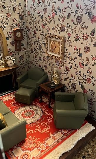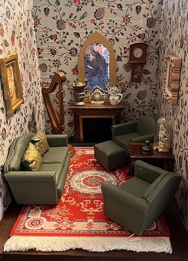 And then, because I was in A MOOD, I decided to tackle my new miniature room, and for the record, let me just clarify that it’s a miniature room, NOT A DOLL HOUSE because that’s a road that, as much as I’d love to go down, is also a rabbit hole that I may never emerge from. But last week, before we went to that awards banquet, I made Ken stop at an antique market up north because I had seen a Facebook post from one of their vendors who specializes in miniatures. Not only him, as it turns out—this place is the MECCA for tiny things and I was super-excited by what I bought, I mean, I got a cute little HARP among other things. I’d been thinking about it all for several days and rearranging things on the counter and looking for ephemera and whatnot, so after our secret library door success, Ken built me a box and I started the room. It turned out even better than I’d hoped and I’m so happy with it. Ken took a look when I was finished though: