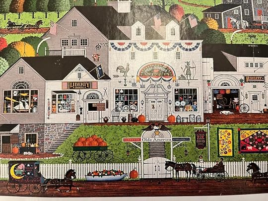 Ken and I love to do jigsaw puzzles. We usually have one going in the kitchen where we can take a minute and pop in a few pieces between other work. I find it relaxing and I think there’s proven evidence that you get a little dopamine rush when a piece clicks. But sometimes I wonder about the people who design them, like what choices are they making with the illustrations? Case in point, last week, we got a new Charles Wysocki puzzle. Charles Wysocki was an American painter who specialized in “primitive Americana”. If you’ve ever done a Wysocki puzzle, you know it heavily features this idyllic view of late 1800s towns with a LOT of American flags everywhere, and as a Canadian, I find this weird, because I’ve never done a Canadian puzzle covered in OUR flag, but sometimes there are also clocks, so it all evens out. This week, though, I opened up the new puzzle and looked at the poster, excited to discover that all the buildings were antique stores and curiosity shops. “Oh, wow!” I said to Ken. “Look at all the cool stuff in the windows of these antique stores!” He agreed that it was going to be a lot of fun, considering we have an antique business ourselves, and I started to build the frame. But then I looked closer and something dawned on me: the painting the puzzle was based on represented life in the 1800s, and all the people were wearing old-timey clothes and driving horses and buggies so NONE OF THE THINGS IN THE WINDOWS WOULD BE ANTIQUES! The stuff in the stores were things that those people would have used every single day and probably thought were modern conveniences! Like the railroad lantern, the ironstone china, and the coffee grinder. So unless this town is one of those places where actors are all dressed up and pretend to be pioneers for the tourists, it’s seriously out of whack.