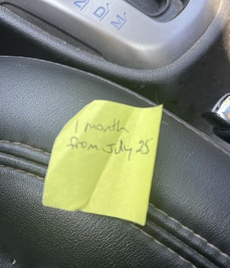 The other day, I was out doing errands. I must have gone to three different plazas to buy things from at least 2 stores at each one. At some point, I realized that whenever I took a step, it sounded like one of my flipflops was making a shuffling/scraping sound. I figured it was just the asphalt, but eventually, it started to trigger my misophonia, so I got to the car, and looked at the bottom of my shoe. Stuck to the underside of my flipflop was a bright neon green sticky note. It was slightly crumpled up. I unfolded it, and it said: “One month from July 25th”. That was all.