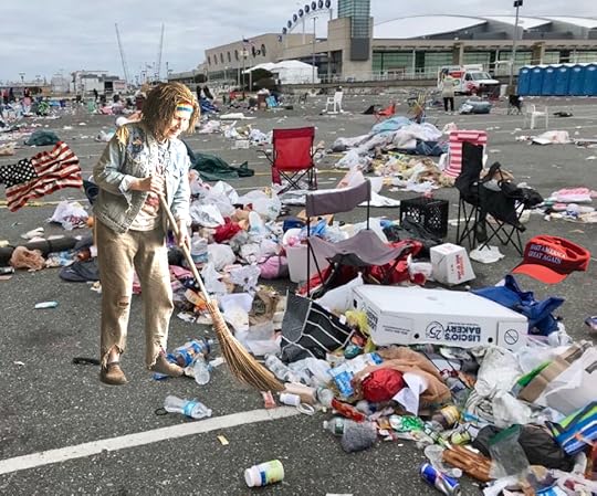 Featured image: Peter made the AI image from a news photo of the mess after the Wildwood election rally. He added 2 items from other rallies: a red hat and an abandoned flag. Doña Quixote with broom shows her hubris by imagining that she still can contribute to setting right our sociopolitical mayhem. Isn’t it […]