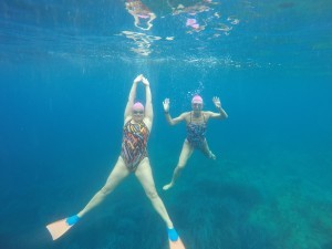 The trip feels like a magical dream. Every morning after a relaxing and scenic boat trip, we swim around different islands and enjoy long lunches in quaint villages. The three speed groups that have been established allow us all to swim at a pace that feels right. My pink swim group buddies are my husband, Chris, and Fran Lou. We are soon dubbed “the explorers” because we rarely miss the opportunity to capture a photo, propel our way into a cave or surface dive to recover a sea urchin skeleton from the bottom. All three of us are athletic and adventurous so we make a great swimming team. Suzanne Williams jumps in to join us for a couple of swims, instantly adopting the adventurous, explorer spirit, pointing out starfish nestled in the limestone beds as we swim along.