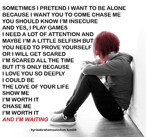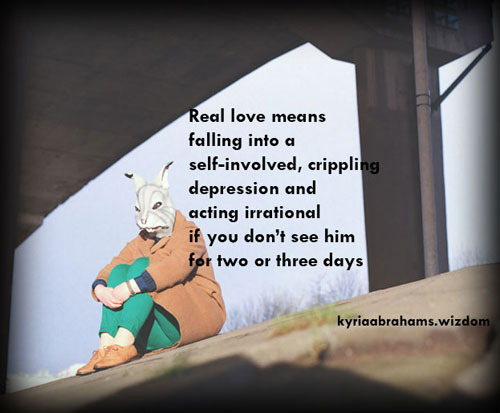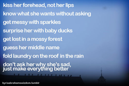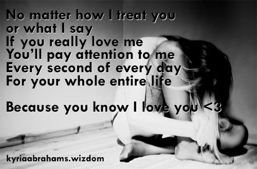 Ridiculous, right? Except that within 15 minutes, two random teenagers (Natasha and Kaitlyn Renee) had already shared—without irony—the above image, which champions the idea that a woman should slump into a depressed tantrum in the corner and a man should love her unconditionally despite her otherwise monstrous behavior.I was both disturbed and victorious.So if you’re one of those sleazy thirtysomethings who is still trying to fuck 19-year-olds, take note. This is what you’ll be fucking. I don’t think for a moment it will deter you; I’m just exhorting you to enjoy that tight pussy before she starts cutting your name into her forearm and demanding you take her ice-skating in the rain in July.Please visit my Tumblr page for more kyriaabrahams.wizdom.