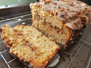 Grease a loaf pan; set aside. Preheat oven to 350-degrees F. Peel, core and dice apples very small and mix with sugar and cinnamon; set aside. in a small bowl, blend brown sugar and cinnamon; set aside. In a large bowl, beat oil, brown sugar,eggs, yogurt and extract until smooth. Add flour, baking powder, cinnamon, nutmeg and cloves. Continue beating until well incorporated. It does not have to be lump free. Pour half the batter in prepared pan. then half the apple mixture evenly over the top, then half the spice mix evenly over the apples. Repeat , this time pressing the apples just slightly into batter. Dot with the butter and bake 75 minutes, or until the middle bounces back when pressed. Remove from oven to cool before glazing with a mixture of 1/2 cup powdered sugar with 3 tablespoons milk or water.