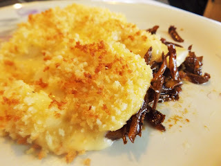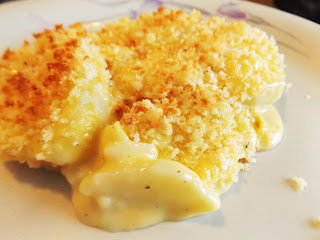 Begin by slicing potatoes 1/2-inch thick. Place in a large saucepan, cover with water and boil until just fork tender, about 8 minutes. Carefully pour into a strainer allowing to drain and dry while making Caramelized Onions and cheese sauce. Prepare Caramelized Onions first by placing 2 tablespoons butter with olive oil and maple syrup in a large skillet over medium high heat. When butter has melted, add onions and cook for about 20 minutes, stirring often, or until browned. Remove from heat and immediately transfer to 9-inch square baking pan, or equivalent; set aside to cool. It may harden, which is perfect.Preheat oven to 400-degrees F.Melt 3 tablespoons butter and mix with panko crumbs evenly; set aside.Melt remainder of butter, with garlic, in a medium saucepan over medium heat. Cook 3 minutes. Whisk in flour until smooth. While still on heat, add milk, salt and pepper, blending well. Continue cooking and whisking until milk has thickened. Add both cheeses and remove from heat. Sir until cheese has melted.To assemble, layer cooked potatoes over the onions. Pour cheese sauce over the top evenly and sprinkle panko crumbles over the top. Cook 20-25 minutes, or until bubbling and lightly browned. Remove to serve hot.