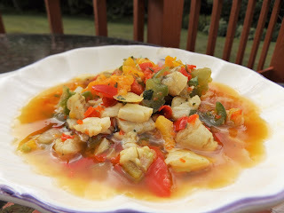 1 pound firm, white fish of your choice3 tablespoons extra virgin olive oil1 each green, yellow and red bell peppers, julienned1 small onion, diced1 habanero pepper, seeded and minced2 cups vegetable broth1/2 cup white wine vinegar *1 tablespoon chopped, fresh basil(or 1 teaspoon dried)1 teaspoon garlic powder1/4 teaspoon dried gingerPinch allspice, optionalSalt and black pepper to taste
