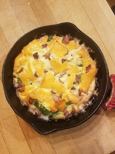 I warm my cast iron skillet while I slice the bacon into little strips. While bacon is browning, beat eggs and cream. Feel free to add salt, pepper, a dash of ground mustard seed. Remove bacon from skillet and add egg. Lay baby spinach on the egg, then add bacon. Tear the cheese and lay on top.