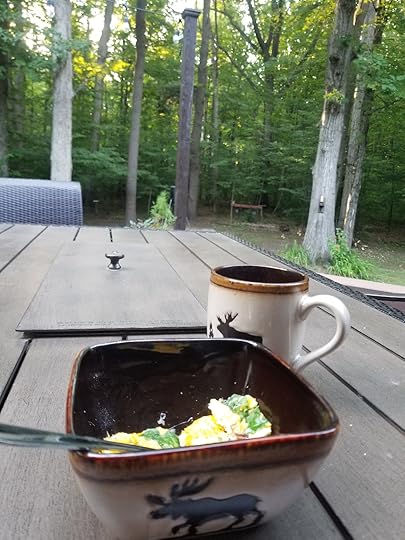 I decided to enjoy breakfast on the deck. Squirrels scattered as I took a seat but quickly returned to their morning meal.