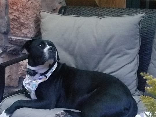 Reyka is needy today and I'm only happy to smother her with pats and kisses. Sonewhere nearby, a squirrel complains of the lack of corn spread about the front yard.