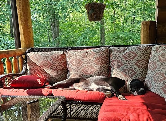 As time has slipped away, we built the back deck and the boys have left the nest. The porch doesn't get used as often. However, it is still a peaceful place to relax. On rainy mornings, I enjoy doing yoga and meditation while breathing in fresh air. To avoid sun and heat, I enjoy the quiet to write and Reyka lounges nearby.