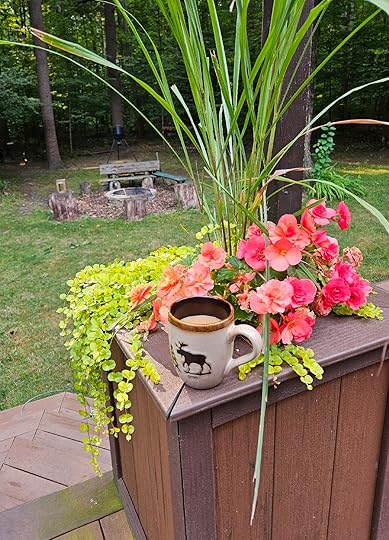 I like to grab a cup of coffee to sip while the dog is doing her morning routine. I admire the flowers I managed to plant during a fybro flare and I remember fun times around the bonfire pit. I enjoy the sun on my face and am thankful for another day.