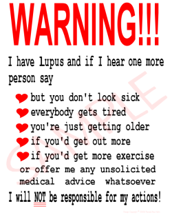 I have Lupus, a “sub-category” of Connective Tissue Disease and at times my body is racked with pain to the point of sitting and doing nothing hurts even more. Most people don’t know I have it, and many that do know don’t understand what it is.... because I don’t look sick.