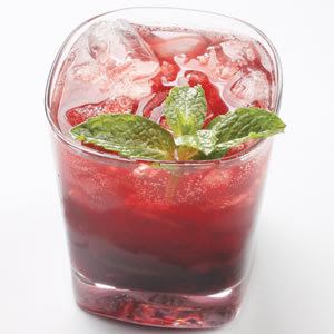 Using 4 glasses evenly divide the cherries, mint leaves and sugar. Mash the ingredients with a wooden spoon and then stir in the rum and the lime juice, top it off with seltzer. Add mint sprig for color.