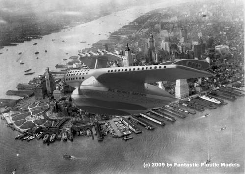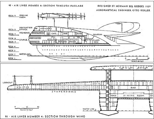 Norman Bel Geddes (1893-1958) was an accomplished industrial designer known for aerodynamic form than was as much about aesthetics as wind resistance. He began as a theatrical designer before venturing into furniture, cars, trains and aircraft. Perhaps his most innovative design was Airliner Number 4, a transatlantic boat with a 528-foot wingspan— a 747's is just under 200 feet.