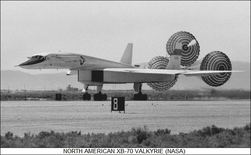 The XB-70 Valkyrie was a high-altitude deep-penetration bomber capable of Mach 3 and a contender for Coolest-Looking Plane Ever. It was designed in the 1950s and first flew almost 50 years ago—Sept. 21, 1964 to be exact—at which point it had been rendered obsolete by ICBMs. For more information and specs, see the National Museum of the Air Force site. For pictures and video, scroll down…
