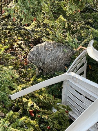 High winds blew a tree down and at the very top was a hornet’s nest.