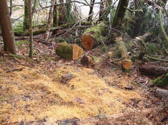 Bourgon focuses her account on thefts from public lands and forest parks of the Pacific North-West. There are giants here, and Methuselahs. “Old-growth” trees, more than two hundred years old, are intagliated with each others’ root systems, with fungal hyphae and with other soil systems we’ve barely begun to understand. Entire ecosystems may stand or fall on the survival of a single 800-year-old red cedar — an organism so huge it may take weeks or months to saw up and remove from the forest, leaving a trail of sawdust, felling wedges and abandoned equipment.