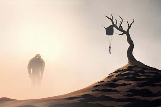 A barren landscape at sun-up. From the cords of his deflated parachute, dangling from the twisted branch of a dead tree, a boy slowly wakes to his surroundings, just as a figure appears out of the dawn’s dreamy desert glare. Humanoid but not human, faceless yet somehow inexpressibly sad, the giant figure shambles towards the boy and bends and, though mouthless, tries somehow to swallow him.