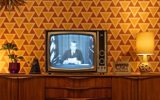 The next thing we see is a desk set in front of a blue curtain, and flanked by flags: the Stars and Stripes, and the Presidential seal. Richard Nixon, the US President, takes his seat and catches the eye of figures hovering off-screen: is everything ready?
