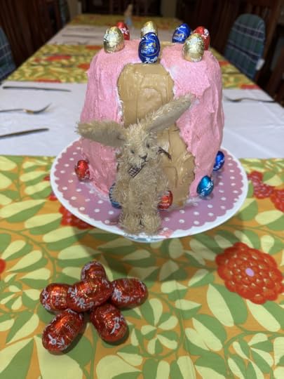 AssemblyI used the raspberry icing to stick the two cakes together, the smaller cake on top of the bigger cake. I then layered the butterscotch icing over the top and along the front and back of the two cakes leaving gaps at the sides. Where the two cakes joined, I used icing to fill the gap and make the icing smooth. I then layered the raspberry icing along the sides of the cakes, filling the gaps. I decorated my cake with Easter eggs.